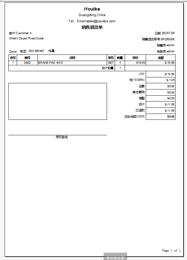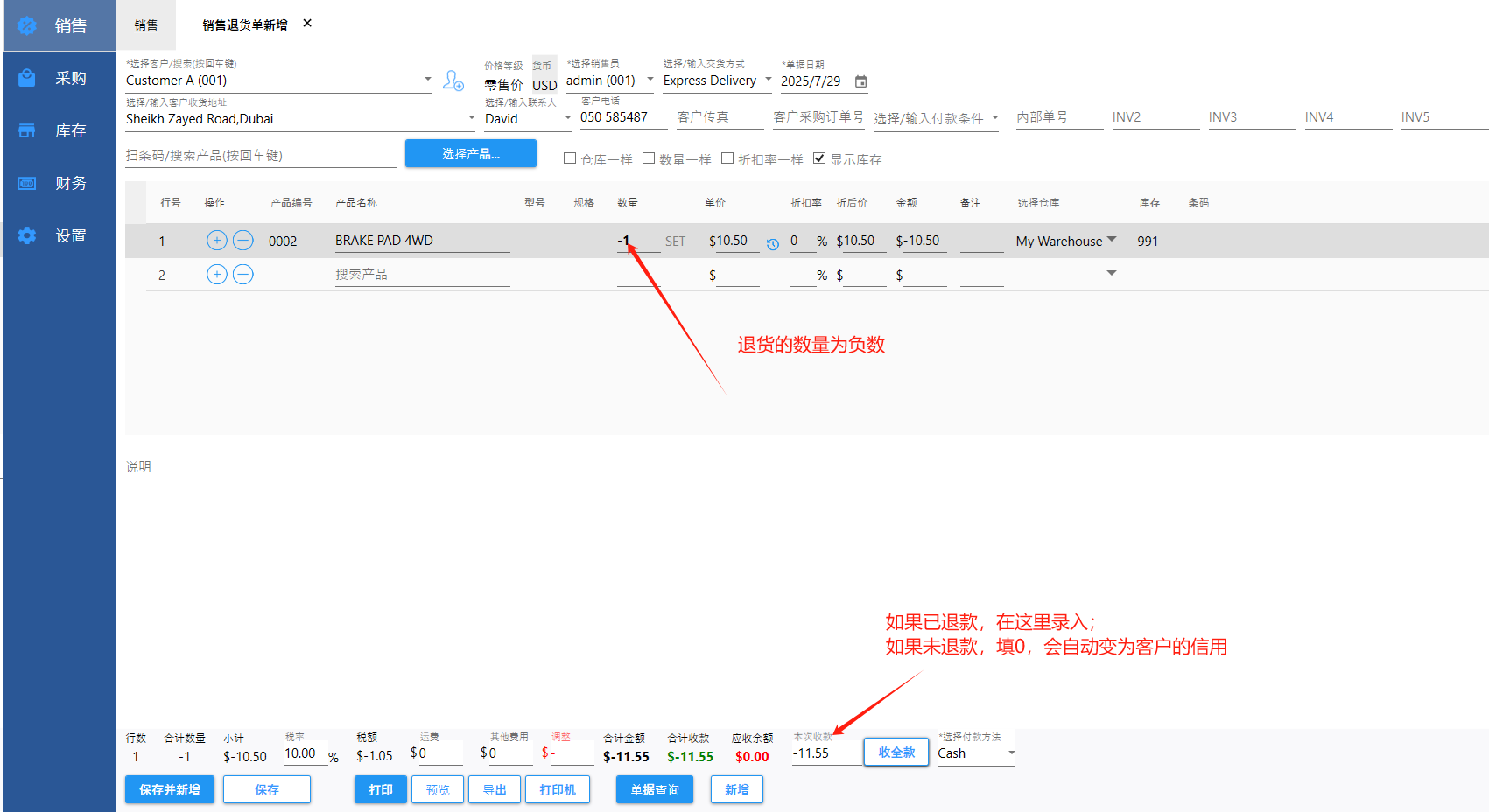 B.在原来的Invoice中修改,增加一行数量为负数的产品(负数数量表示退货),然后保存。