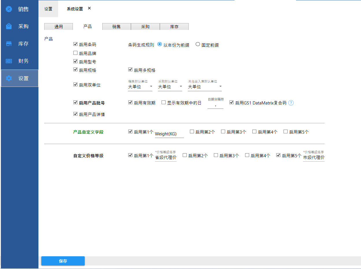 系统默认的销售价格等级有零售价和批发价,如果您还需要其他的价格等级,这时可启用自定义价格等级。