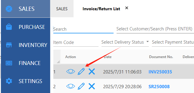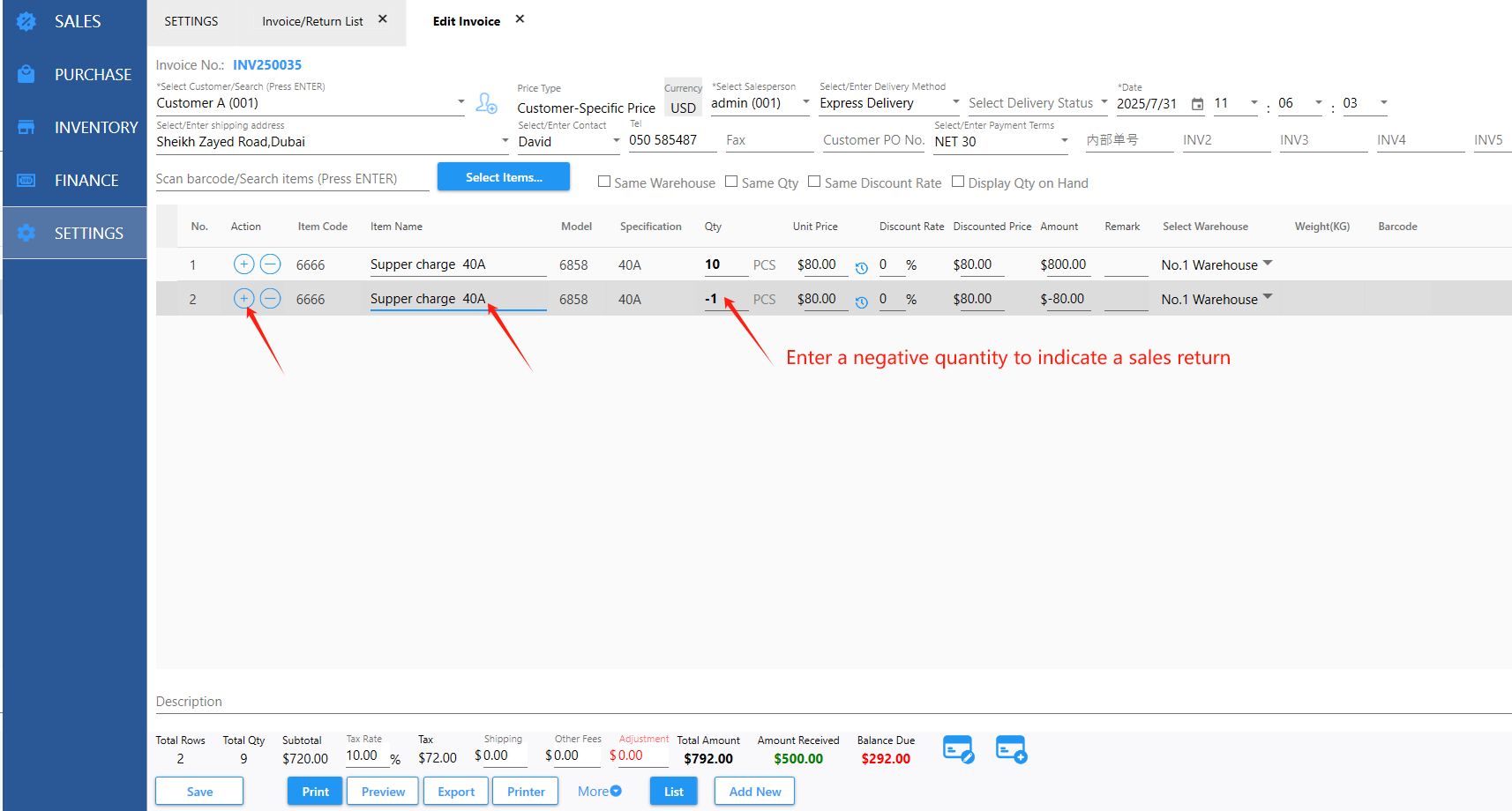 B. Modify the original invoice by adding a row with a negative quantity (a negative quantity indicates a return).