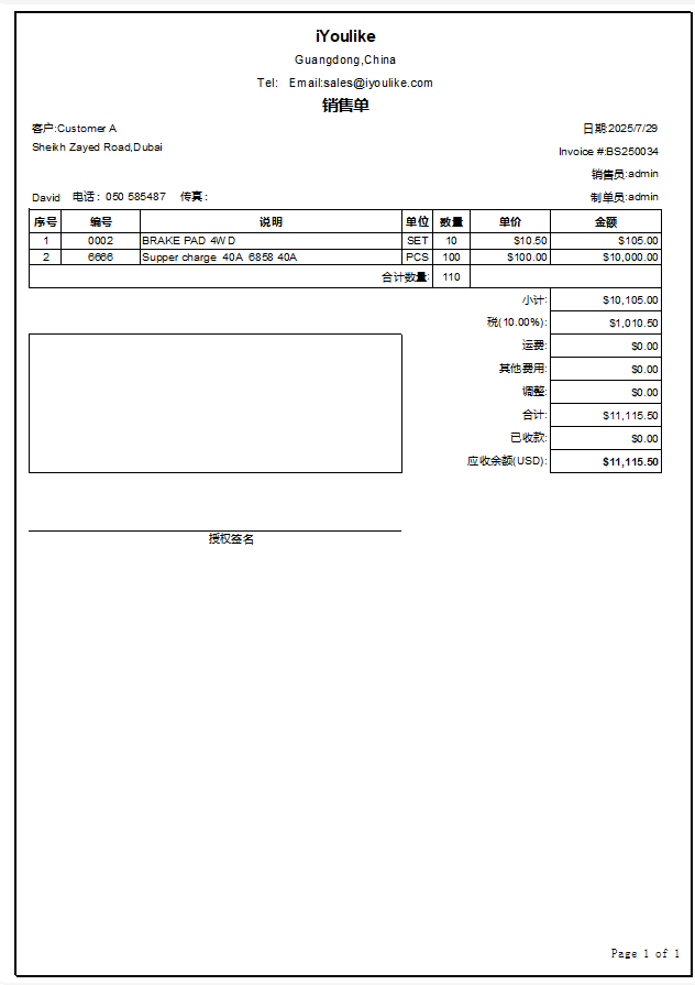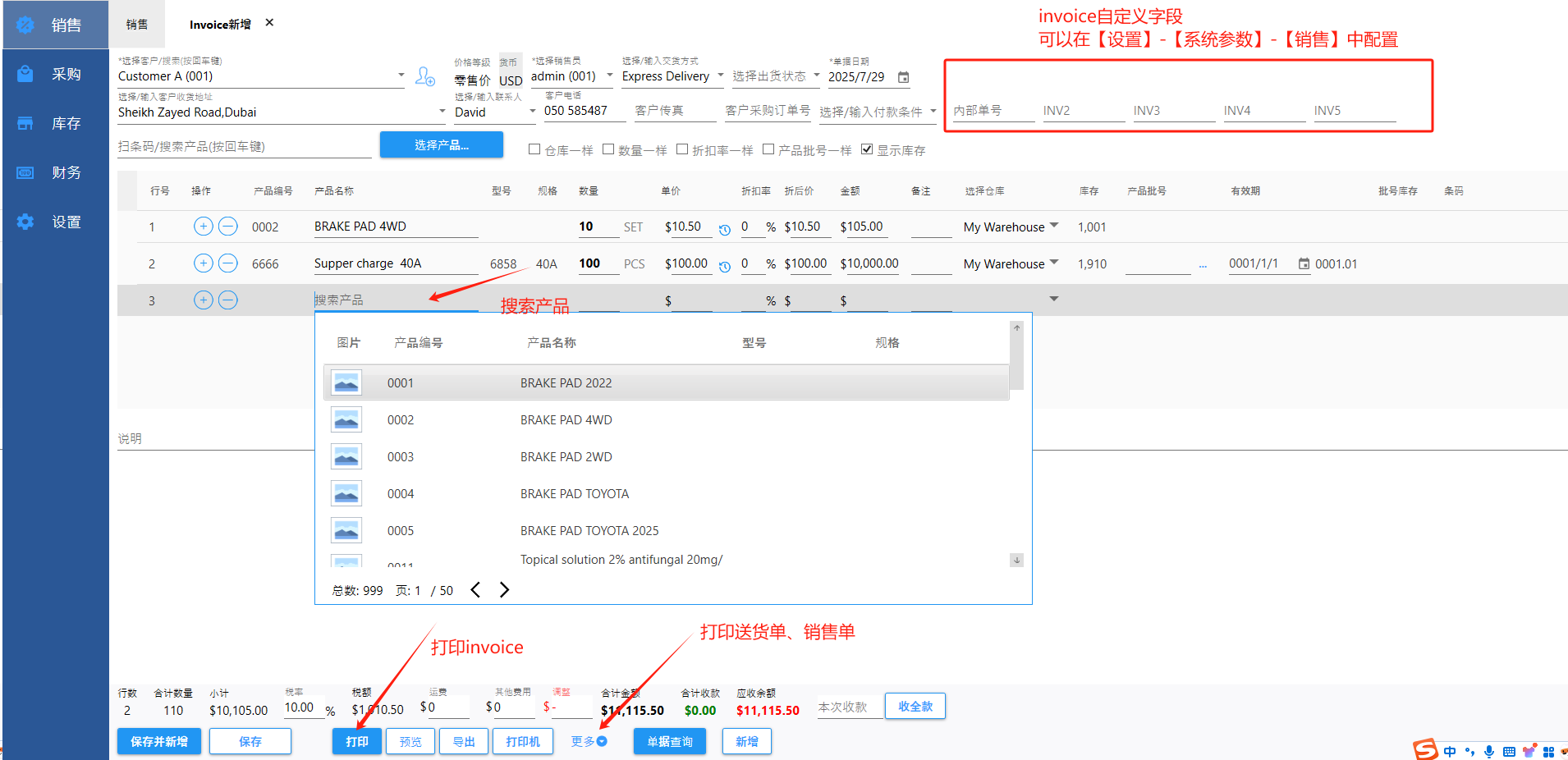 开了Invoice,库存会减少。 除了可以打印Invoice,还可以打印送货单,销售单。